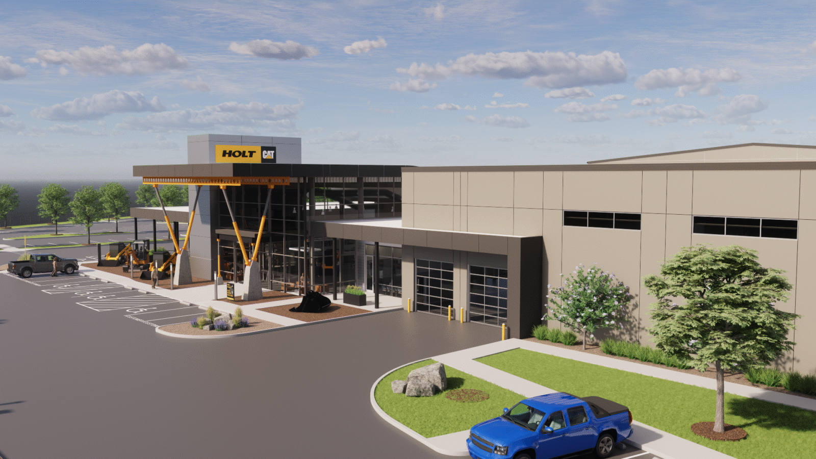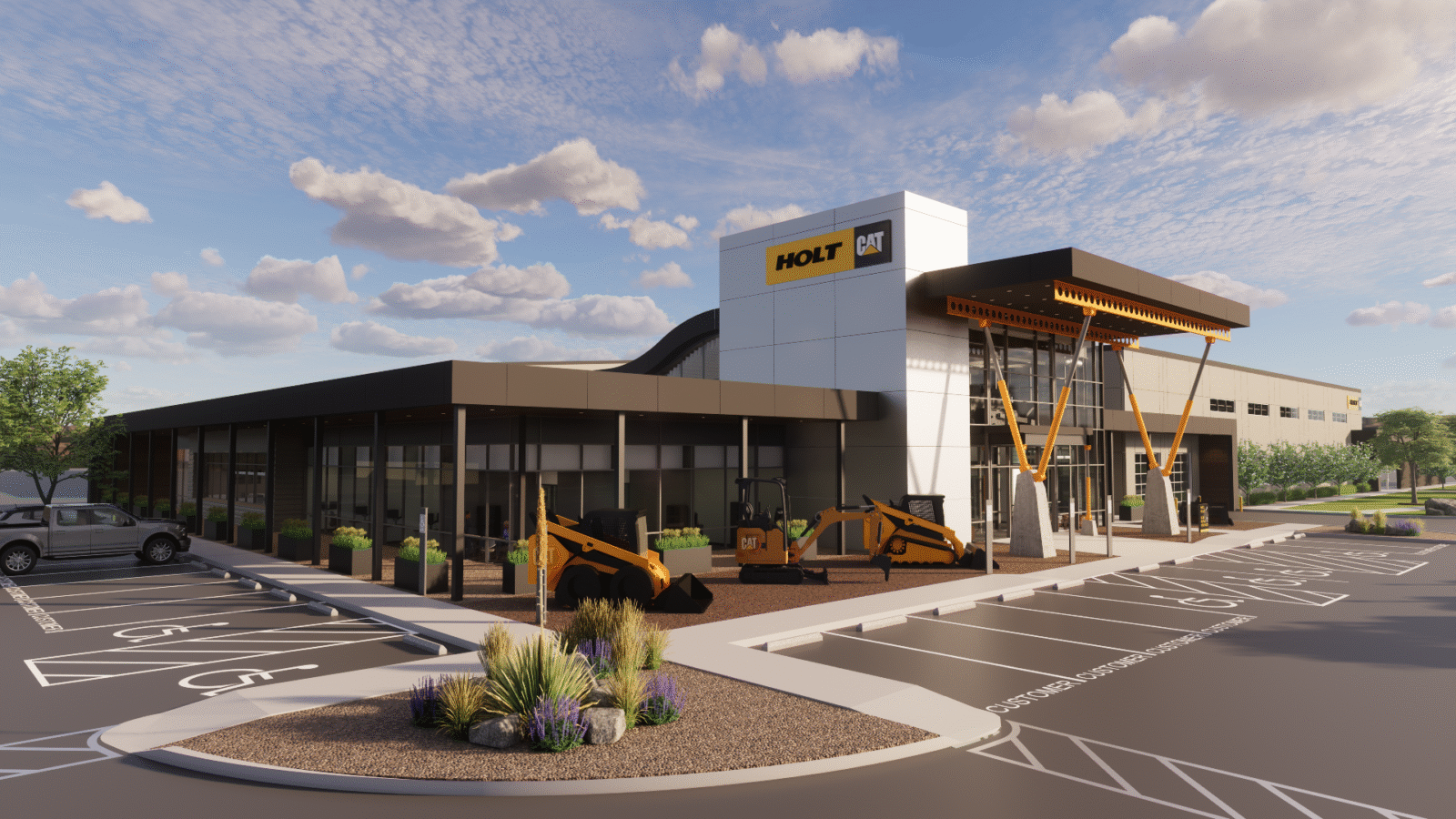 Acuform was happy to continue our long-standing relationship with Holt Cat and is proud to design their largest and most advanced dealership to date, a new flagship facility strategically located to serve as a central hub for the region. This state-of-the-art campus will not only provide sales and service but also support machine rebuilds for HOLT’s network of locations.